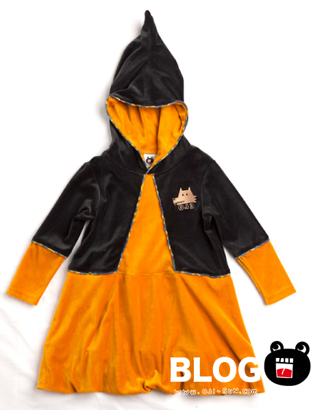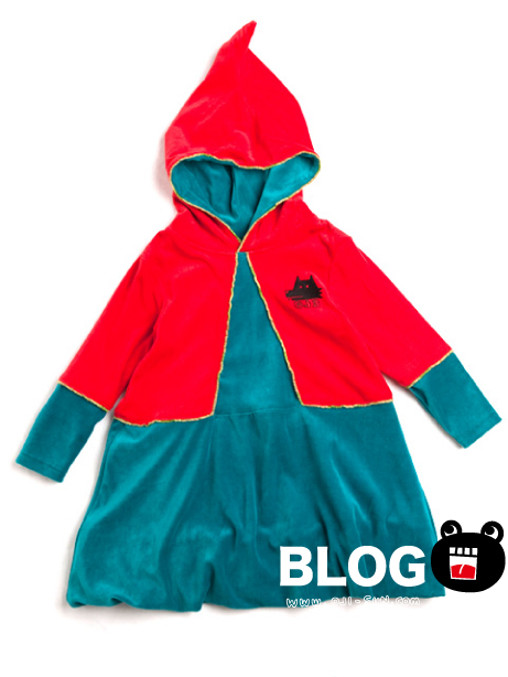 ベロア地に とんがりフードと バルーンスカート。